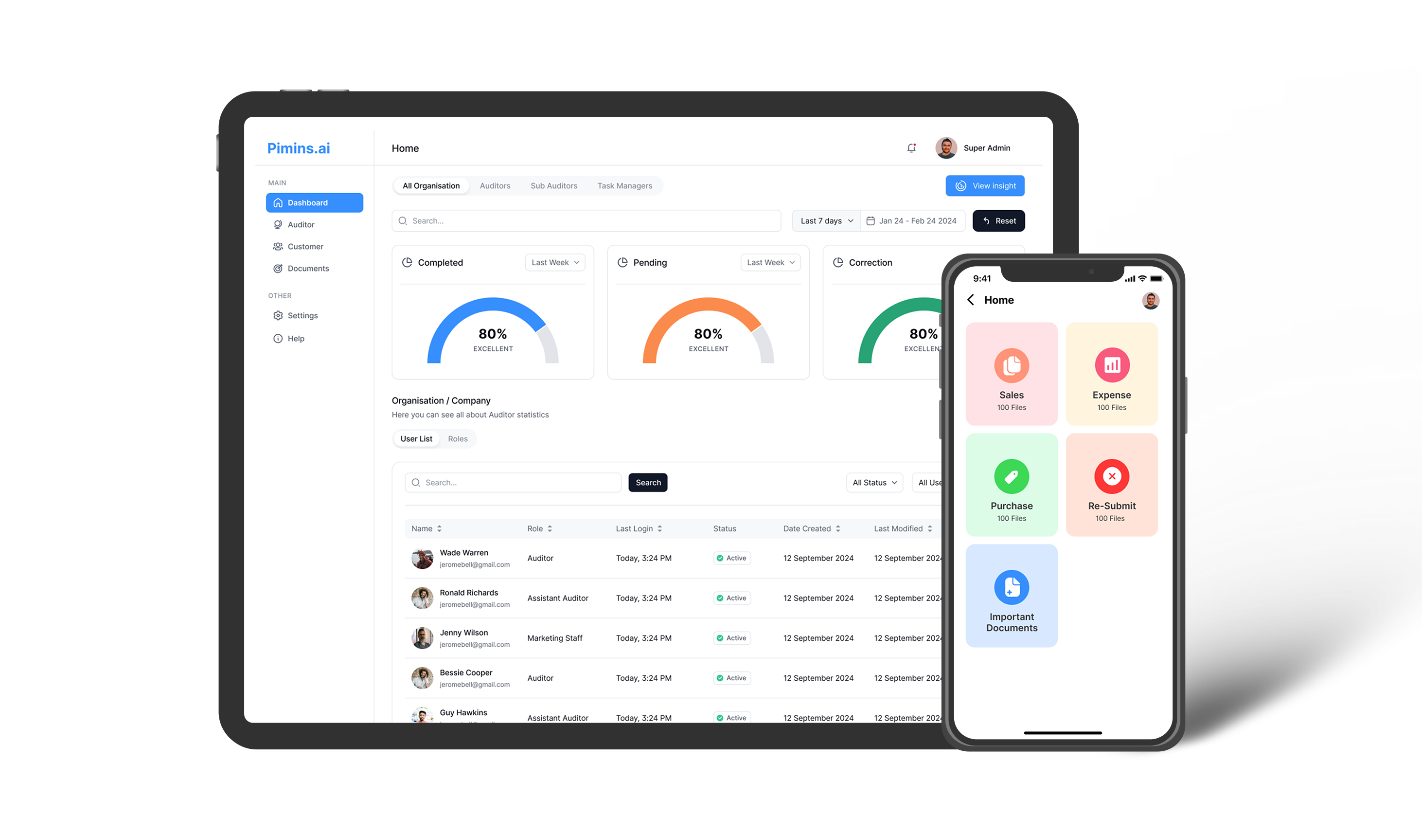 At Pimins, we make it easy for businesses to manage, verify, and store important documents. Our AI tool helps with everything from handling expenses, sales, and invoices to streamlining the workflow. It simplifies scanning, sorting, and approving documents, reducing the effort for your team while increasing efficiency. Best suited for all industries, including healthcare, retail, finance, manufacturing, education, and more, our solution keeps things organized, checks for accuracy, and creates reports to make the whole process smooth, secure, and stress-free.
